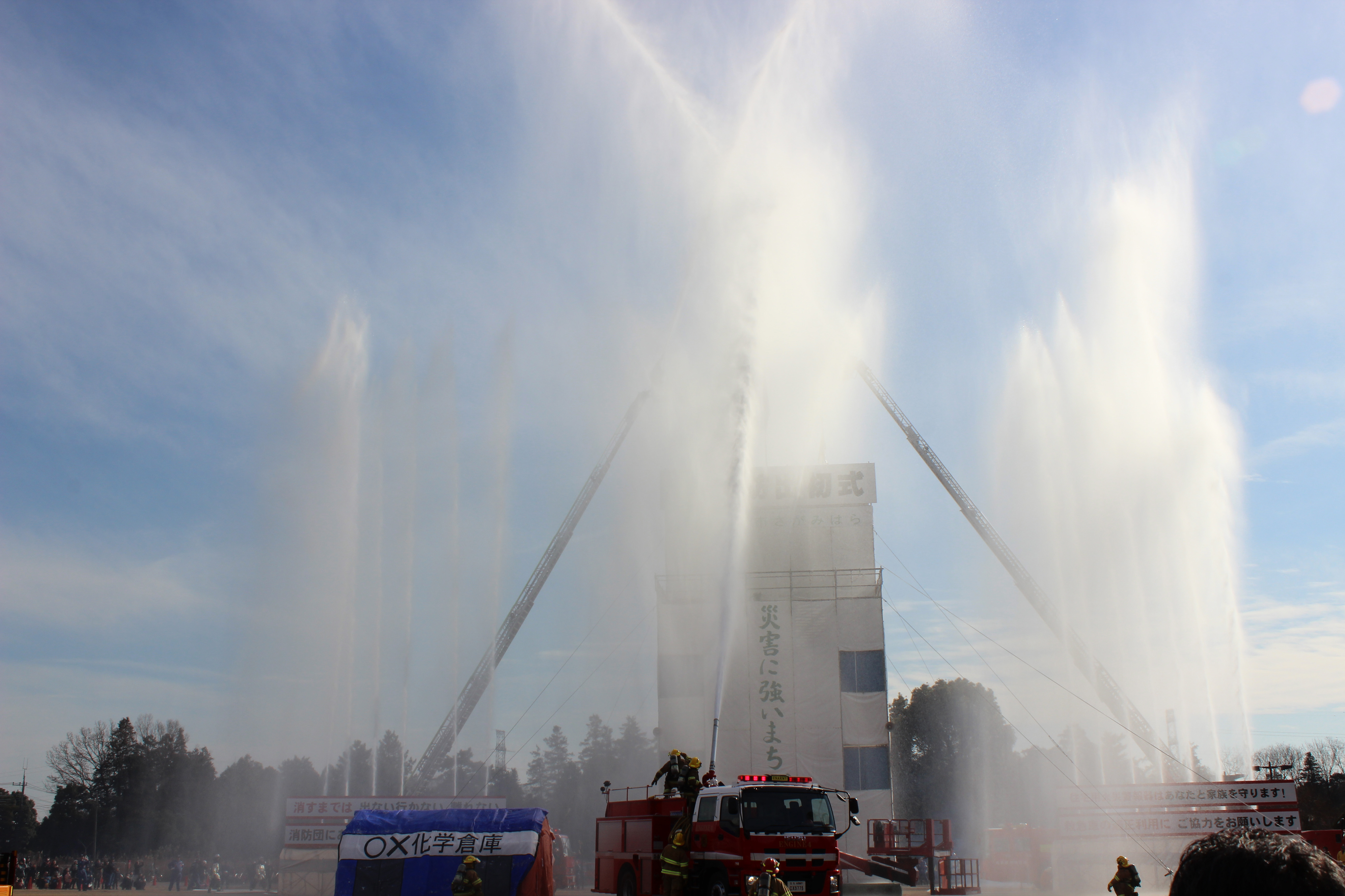 出初式の一コマです。市や米軍、消防団などが協力して放水して素晴らしい演技でした。空高く上がる水が素晴らしく、毎年楽しみにしています。