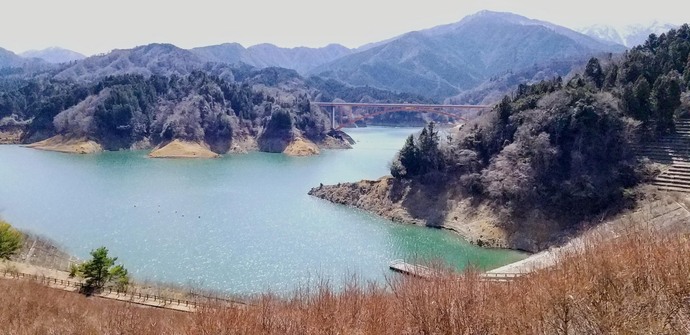 「鳥居原ふれあいの館」から望む宮ケ瀬湖(2024年3月撮影分)