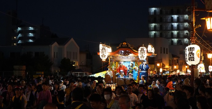 駅周辺の雑踏を掻き分け巡行中の山車(上溝夏祭り)(2024年7月撮影)